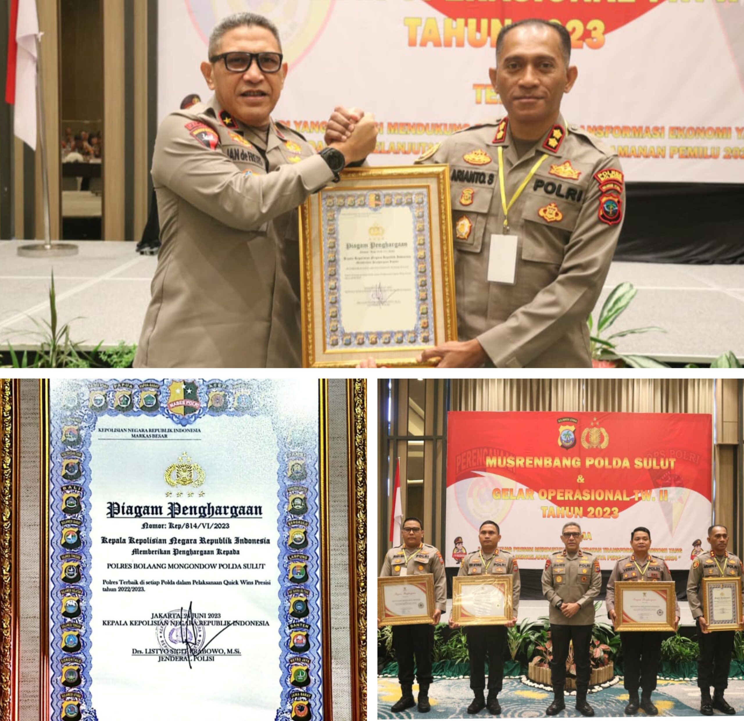 Predikat terbaik tersebut dituangkan dalam sebuah Piagam Penghargaan yang ditandatangani oleh Kapolri Jenderal Polisi Drs. Listyo Sigit Prabowo, MSi dan diserahkan langsung oleh Wakapolda Sulut Brigjen Pol Drs. Jan Leonard de Fretes kepada Kapolres Bolaang Mongondow AKBP Arianto Salkery SH MH dalam acara Gelar Operasional dan Musrenbang Polda Sulut di Hotel Luwansa Manado, Kamis, 10/8/2023.